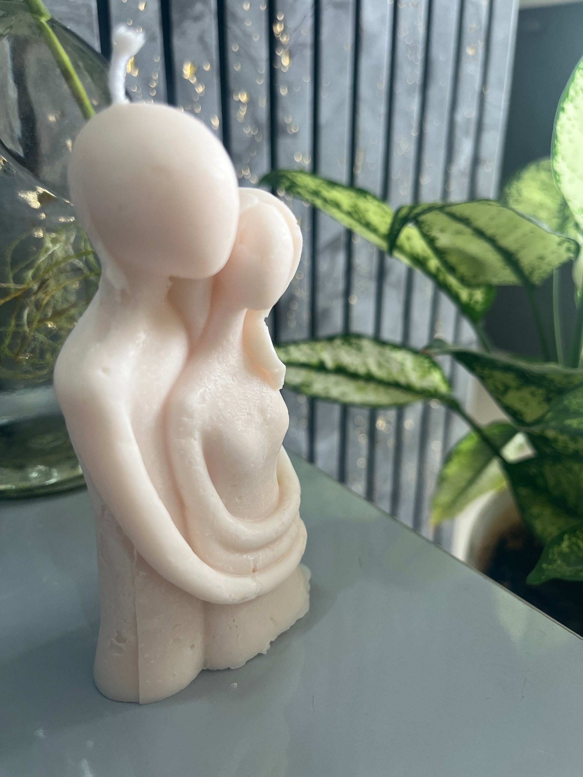 ELEGANT EMBRACING COUPLE SCULPTURE: This beautifully sculpted candle captures a tender moment, featuring a minimalist yet expressive depiction of two figures embracing. Its smooth, elegant lines convey a sense of love, unity, and intimacy, making it a poignant symbol of connection and affection.